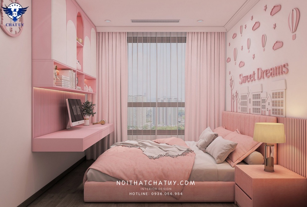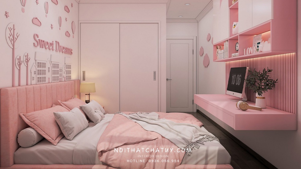 Để giảm bớt đi sự trống trải, phần tường ở đầu giường ngủ được trang trí thêm dòng chữ Sweet Dreams cùng các icon có màu hồng ngọt ngào. Trong phòng được bố trí bàn học được bắt vít vào tường giúp tiết kiệm diện tích. Phía trên bàn học được thiết kế thêm tủ đựng đồ được gắn trực tiếp vào tường. Gia chủ lựa chọn loại tủ đa năng tích hợp với kệ để giúp chủ nhân căn phòng có thể bày trí thêm các vật dụng yêu thích ở khu vực này. Sàn nhà sử dụng loại lót gỗ màu xám nhạt, màu sắc này rất thích hợp để kết hợp với màu hồng, ngoài ra cũng ít dơ nên đảm bảo tính thẩm mỹ cho căn phòng.